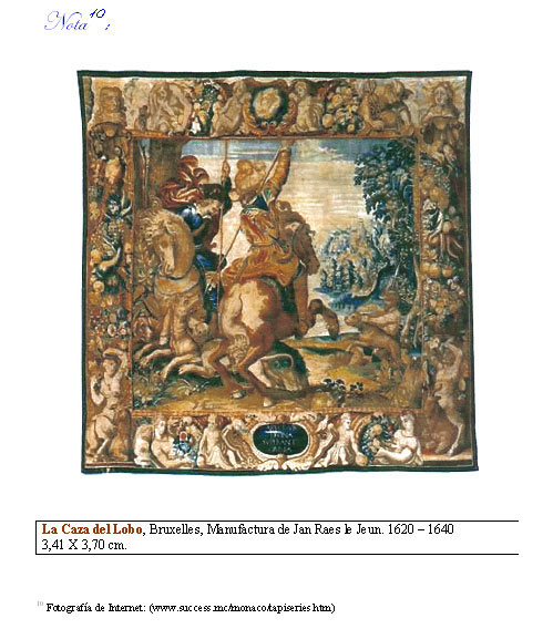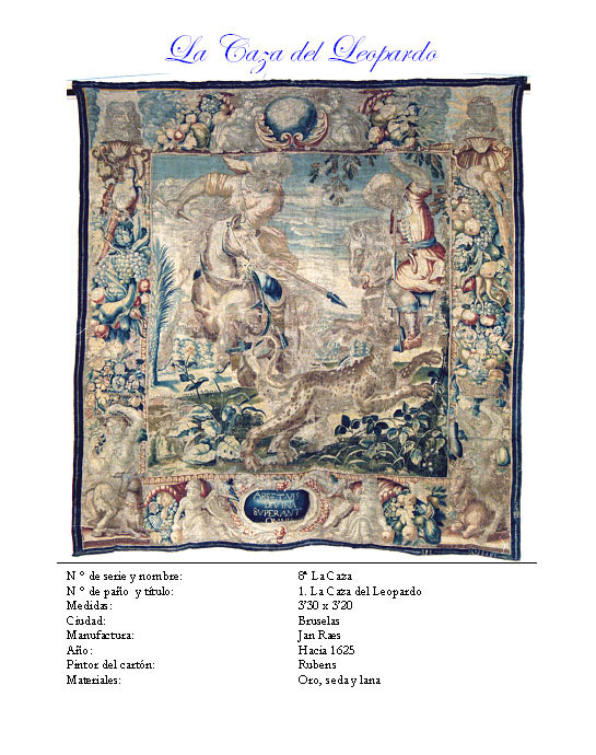 Podemos observar una escena con dos jinetes a caballo, que están a punto de dar caza de un leopardo. Los dos jinetes van ataviados a la manera de vestir turca, con chilaba y turbante. Este atuendo es muy reiterativo en los cuadros y los dibujos de Rubens. Por la característica del atuendo, el movimiento dado a los equinos y la fuerza del felino, no hay ninguna duda sobre la autoría de los cartones que no es otra que Pablo Rubens. En este paño el detalle del felino representa la crueldad (las lanzas), la ferocidad (el animal), y la agresión (el acto de la caza). Las manchas de su piel se interpretan como los ojos del gran observador.