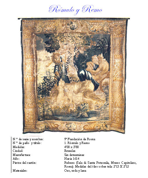 En el paño podemos observar al pastor Faustulus observando a los dos gemelos, míticos fundadores de Roma, mientras en un rincón observando la escena, están sus padres: Silva Rea y el Dios Marte.