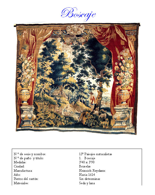 Arboleda de hermoso boscaje, muy semejante a los otros paños que componen la serie. Difiere de los demás tapices en la composición central, en la que podemos observar a un conjunto de personajes rurales efectuando las tareas típicas del campo. Como personaje principal podemos advertir a un pastor con sus ovejas en señal de reposo. Está observando a dos hombres que están tirando de un carro cargado de verdura, mientras son observados, a su vez, por un perro de caza. En un segundo plano se puede reparar en otro pastor reposando a la sombra de un gran árbol, muy cerca del acceso a una cabaña, acariciando una flauta pastoril. A la derecha, con un estudio de la perspectiva muy definido, vemos en lo alto a una mujer con un cántaro en la cabeza, y a la zaga y a su vera, un hombre cargado con un cesto de mimbre intentando darle alcance.