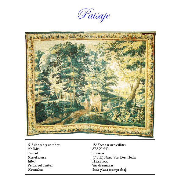 Muy parecido al tapiz 16.1. “La vida campestre”, de autor desconocido. Esta composición representa un paisaje sencillo y tranquilo. Parece que está pensado para ser colgado de una pared donde los hombres y las mujeres se sentarán a hacer sus labores palaciegas.