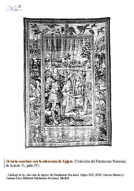La serie fue tejida con lana y seda en Bruselas hacia 1560. Diez es el número de tapices que componen la serie, contando entre sus personajes principales a Julio César, Octavio, Marco Antonio y Cleopatra, relación explicable porque sus vidas fueron paralelas. El autor del cartón se inspiró en varias historias antiguas: Las vidas paralelas de Plutarco y la vida de Augusto, de Suetonio.