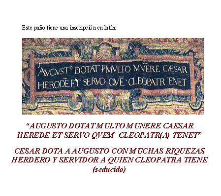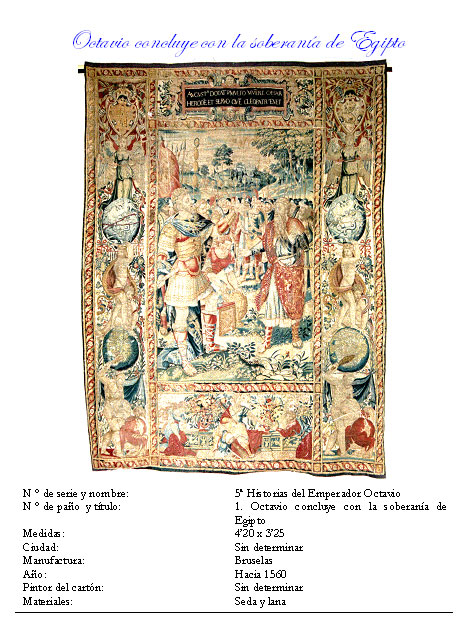 La serie fue tejida con lana y seda en Bruselas hacia 1560. Diez es el número de tapices que componen la serie, contando entre sus personajes principales a Julio César, Octavio, Marco Antonio y Cleopatra, relación explicable porque sus vidas fueron paralelas. El autor del cartón se inspiró en varias historias antiguas: Las vidas paralelas de Plutarco y la vida de Augusto, de Suetonio.